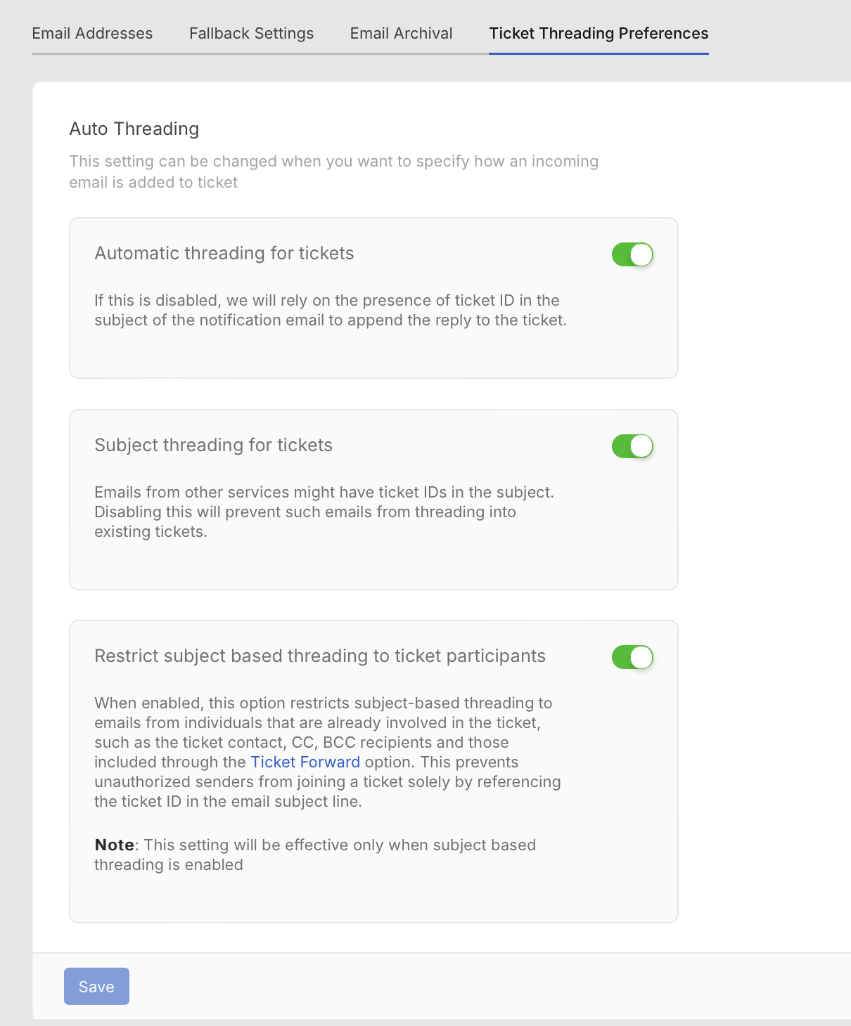 Note: With this enhancement, Restrict Subject-Based Threading to Ticket Participants will be enabled by default on your account. However, if your business relies on receiving emails from third-party senders, we recommend reviewing your use cases and turning off the restriction if needed.
