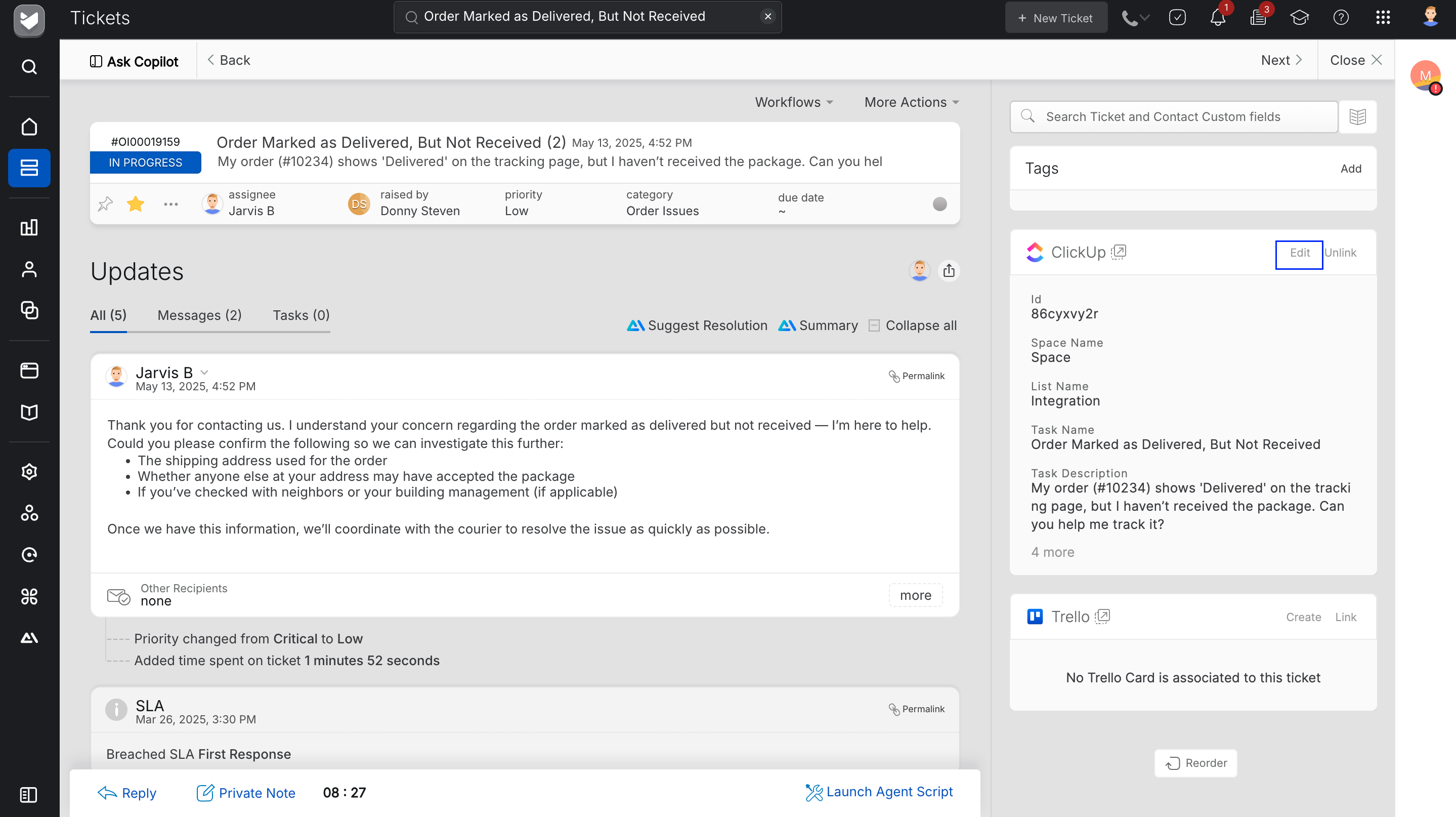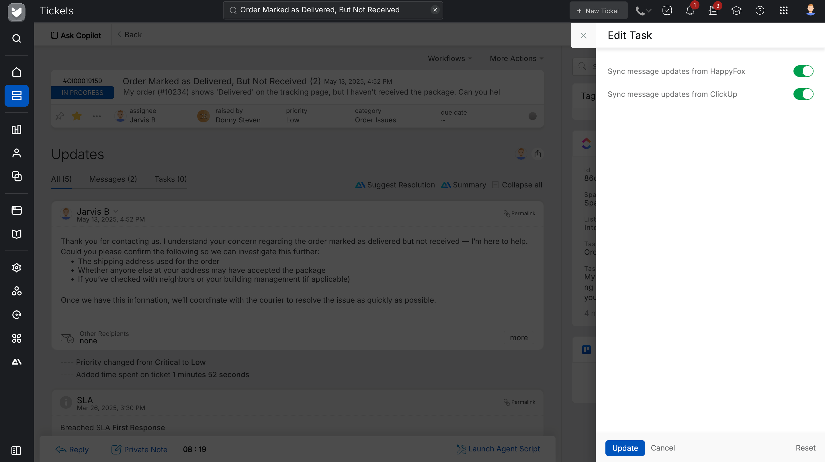 You can synchronize HappyFox ticket updates and ClickUp comments across the two platforms.