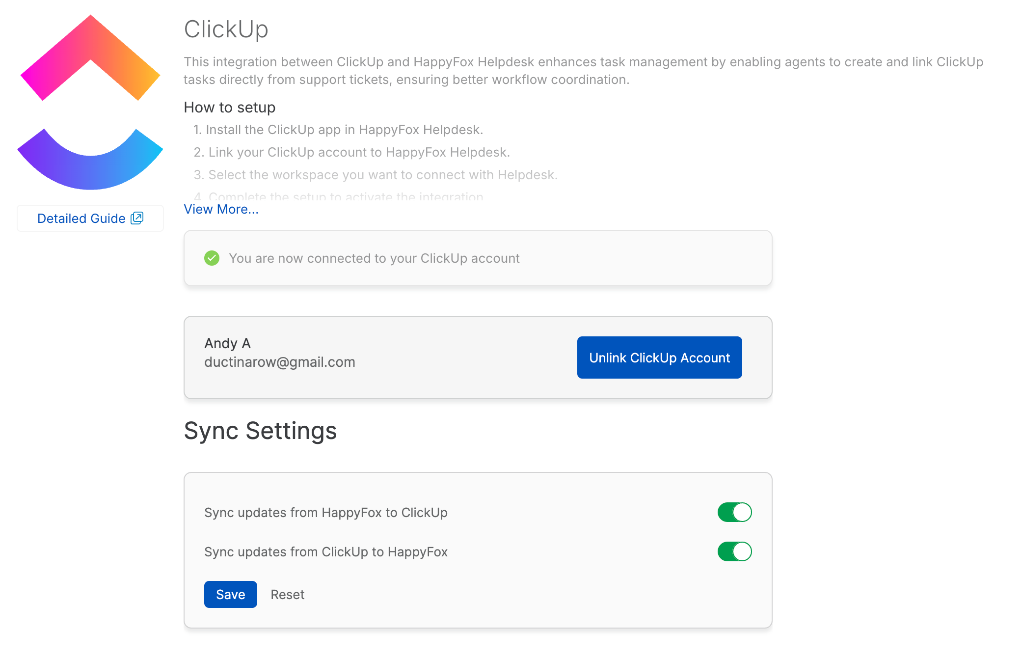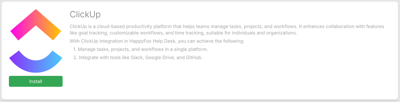This integration enables seamless collaboration between HappyFox Helpdesk and ClickUp, ensuring efficient tracking and management of tasks directly from support tickets.