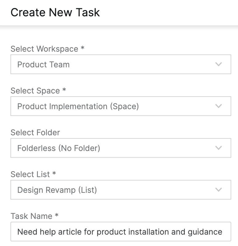 Select the Workspace, Space, Folder, and List where you want to create the ClickUp task.