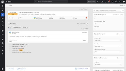 To improve usability in the ticket interface, you can now group custom fields into two sections within the right-side panel: