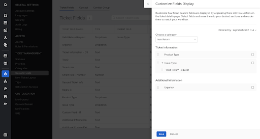- Admins (or agents with Manage Custom Fields permission) can decide which fields go into which section.