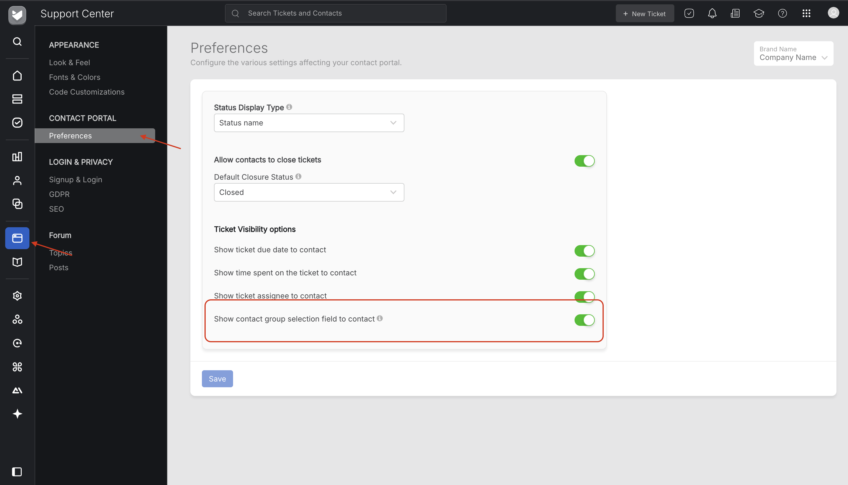 - Show Contact Group Selection Field to Contact - Located under Support Center → Preferences