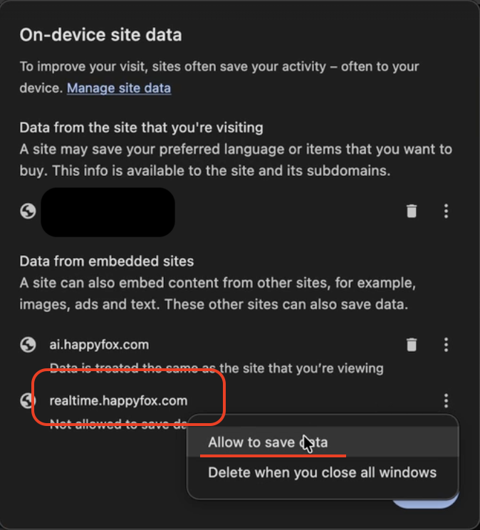 If your account uses a custom domain, your browser may close the connection before it is fully established, causing calls and other things to fail. To fix this, allow realtime.happyfox.com to save data on your device.