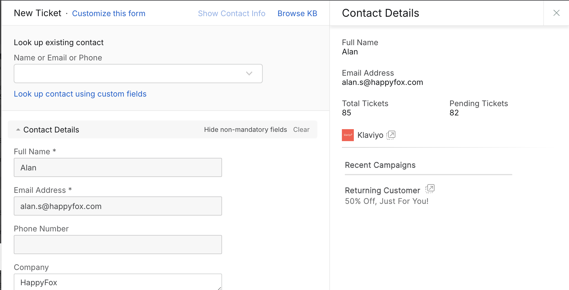 With the Klaviyo integration, your HappyFox agents can view marketing campaign details associated with a ticket’s contact directly within the Help Desk interface without switching between applications.