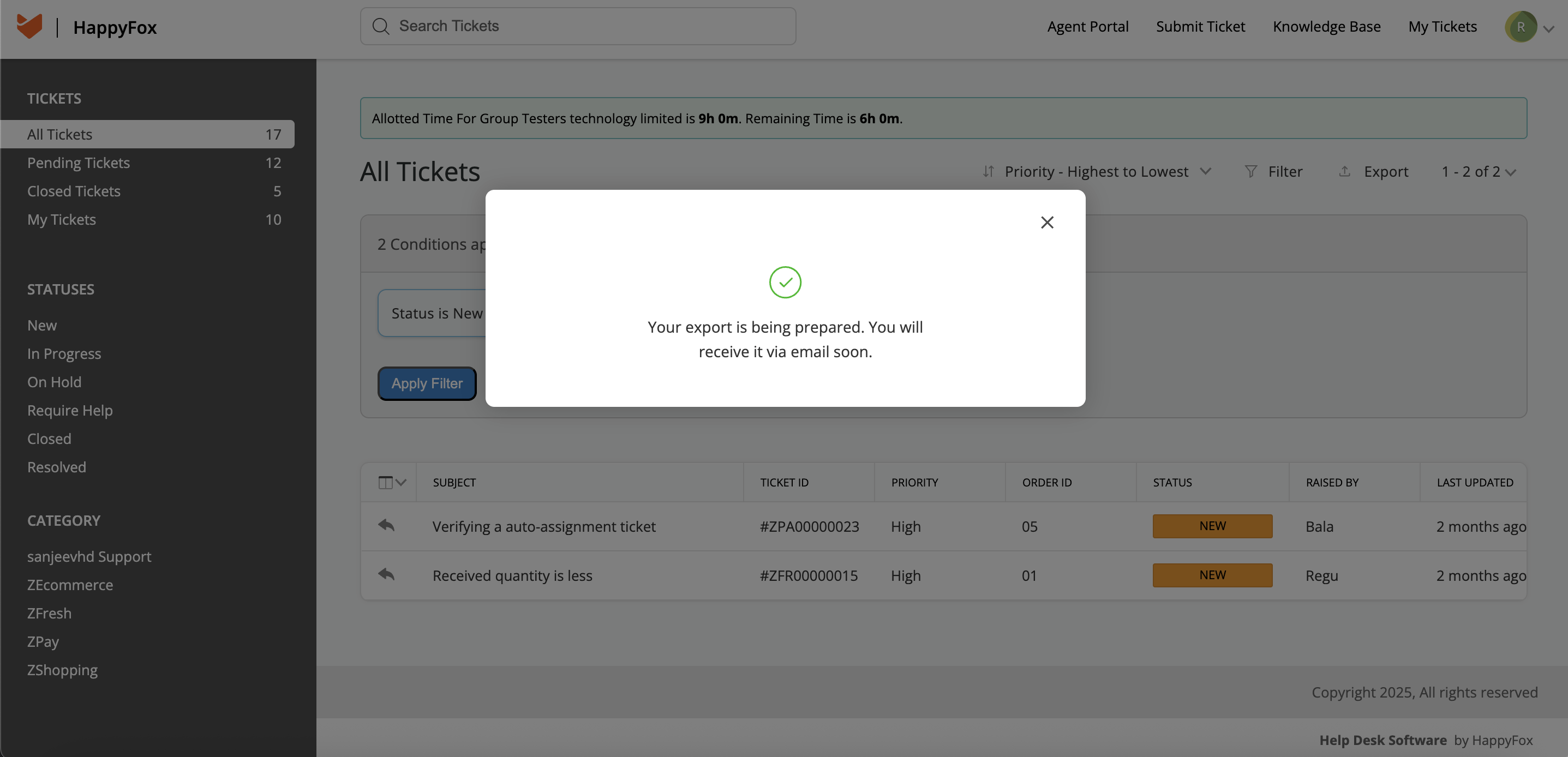 - On clicking it, a confirmation message informs the contact that up to 1000 tickets can be exported at once and that the export will reflect the current filters.