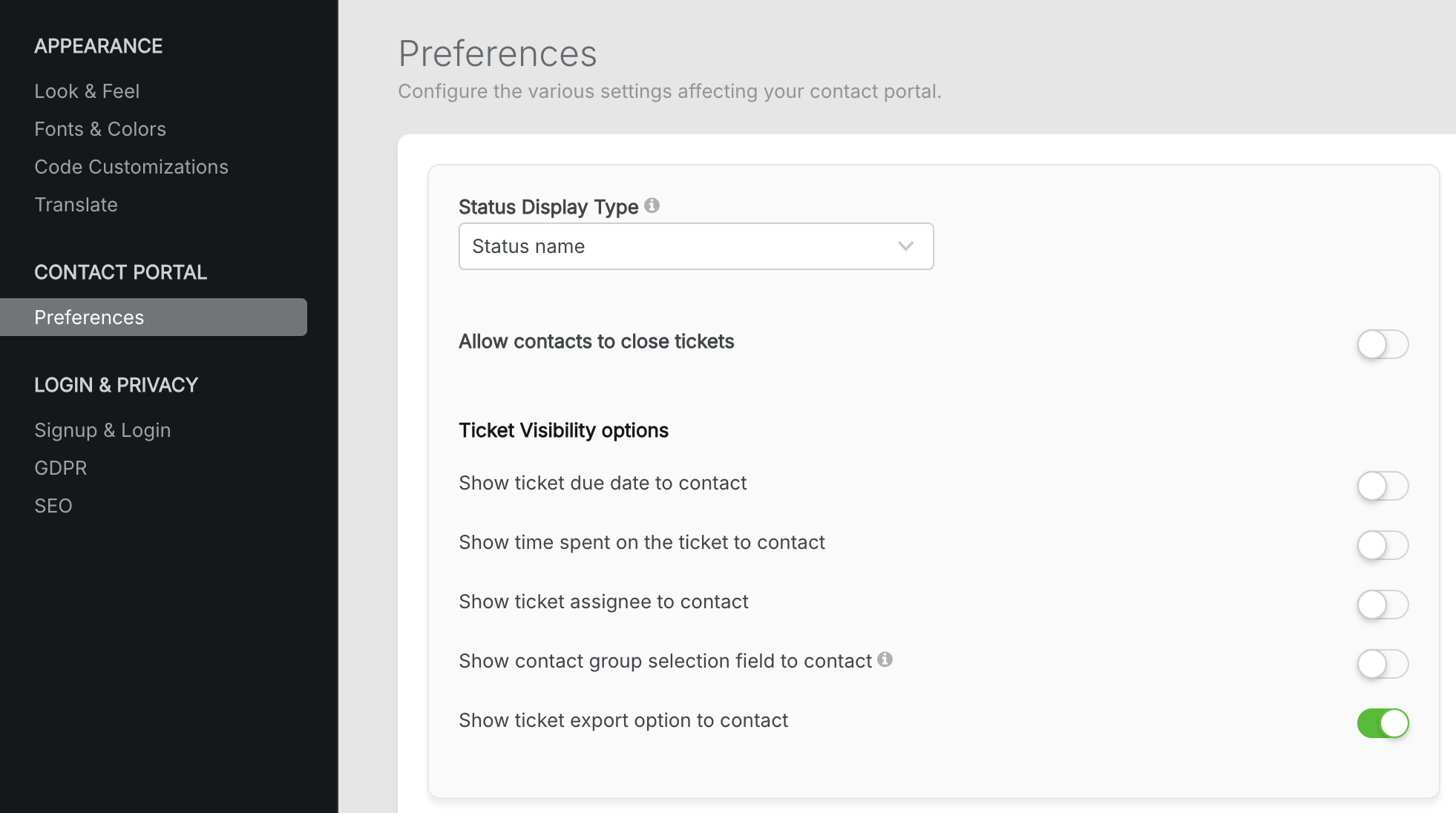 The Ticket Export option appears in the Contact Portal only when the corresponding setting is turned on: