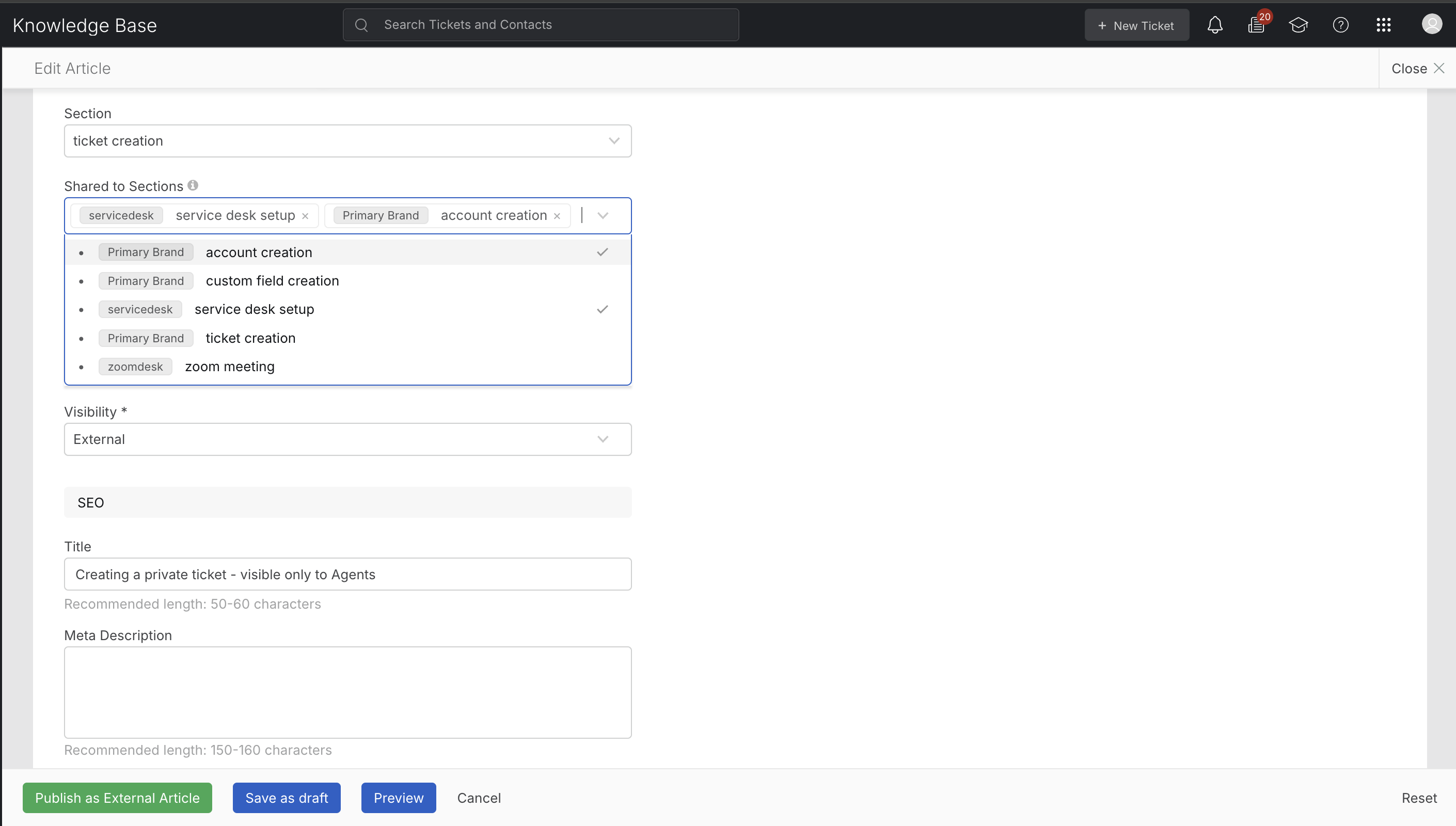 Share a single Knowledge Base article across brands using the Shared Sections option during article creation or while editing. This lets you maintain one source of truth while making the article appear in your other brand knowledgebases.