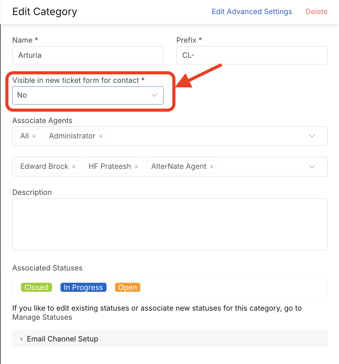 - Navigate to Main Menu > Manage > Categories > Open the category that has to be removed from the submit ticket form