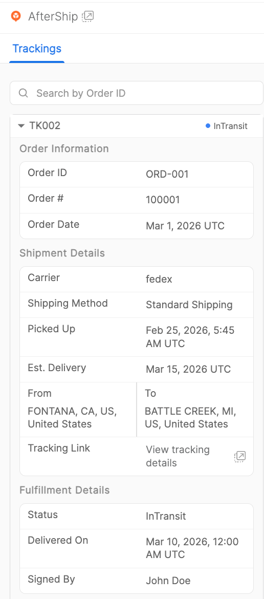 This integration provides visibility into shipment tracking information stored in AfterShip, allowing agents to quickly respond to delivery-related customer queries.
