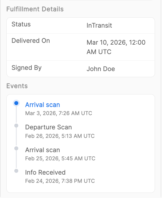 The Fulfilment Details section summarizes the delivery status of the shipment.