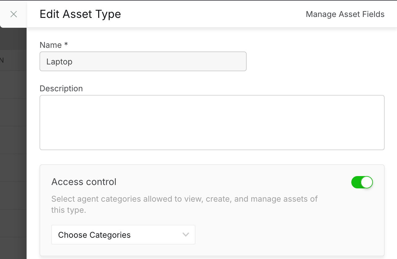 Note: Only agents with Manage Asset Types permission can enable this toggle and assign categories.