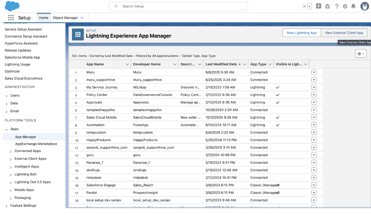 2. In the menu bar on the left pane, please go to Apps and select App Manager. Create a New External Client App.