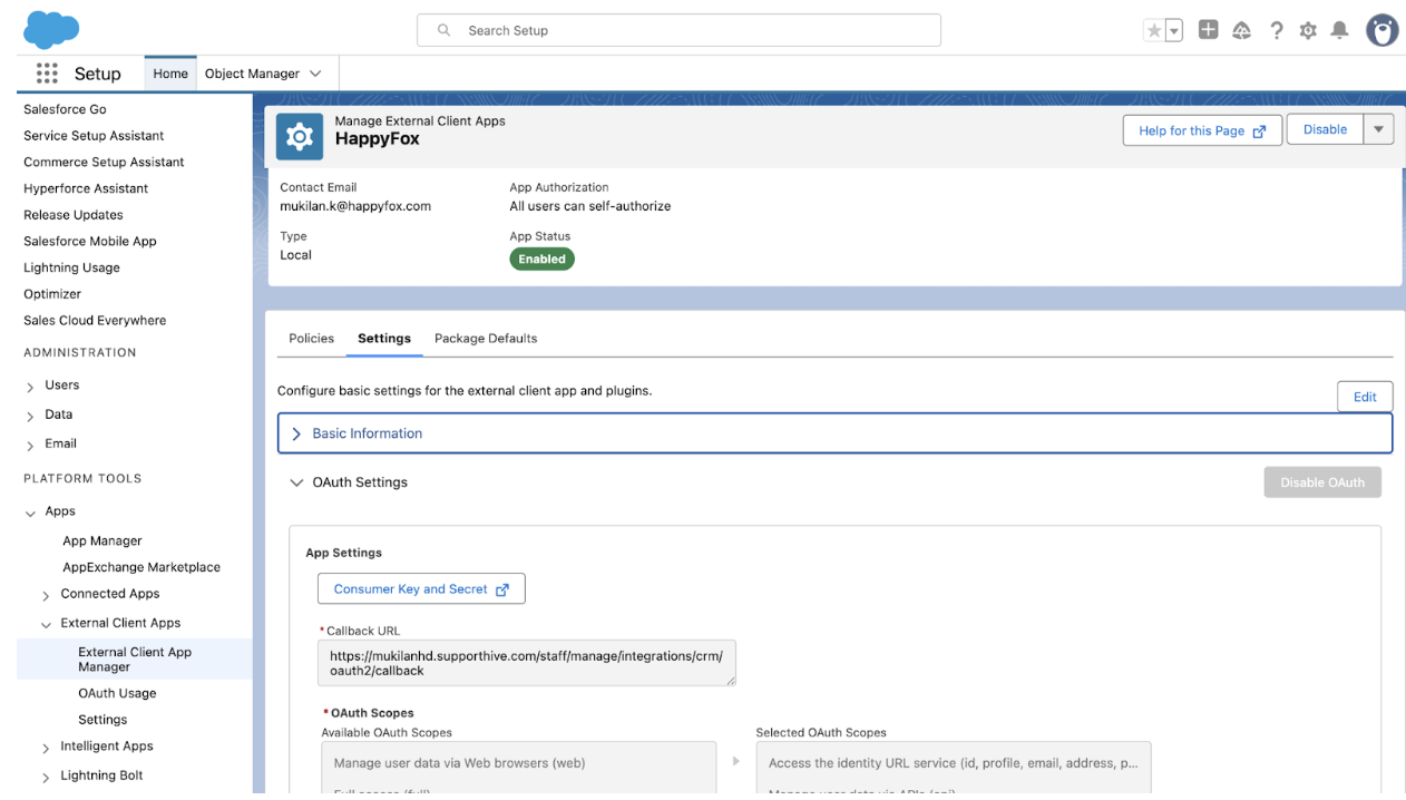 4. Enable OAuth Settings and use URL (https://<youraccount>.happyfox.com/staff/manage/integrations/crm/oauth2/callback) to fill callback URL.