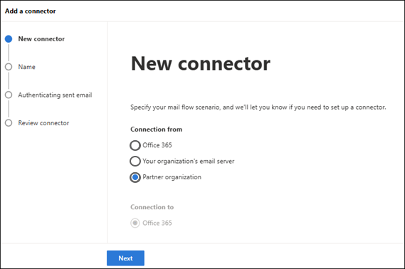 Step 3: Under Select your Mail Flow Scenario, set the "From" field as Partner Organization, and the "To" field as Office 365. Click "Next" to proceed.