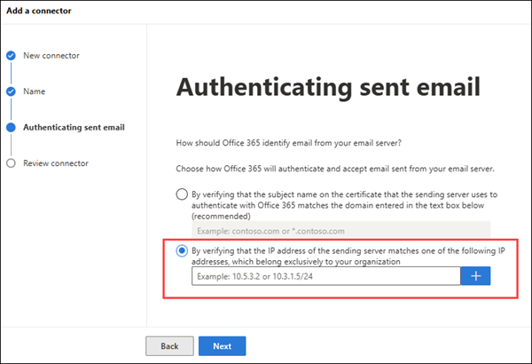 Step 5: Under "How should Office 365 identify email from your email server", select the second option, and click the “+” symbol to add the HappyFox NAT IP address.