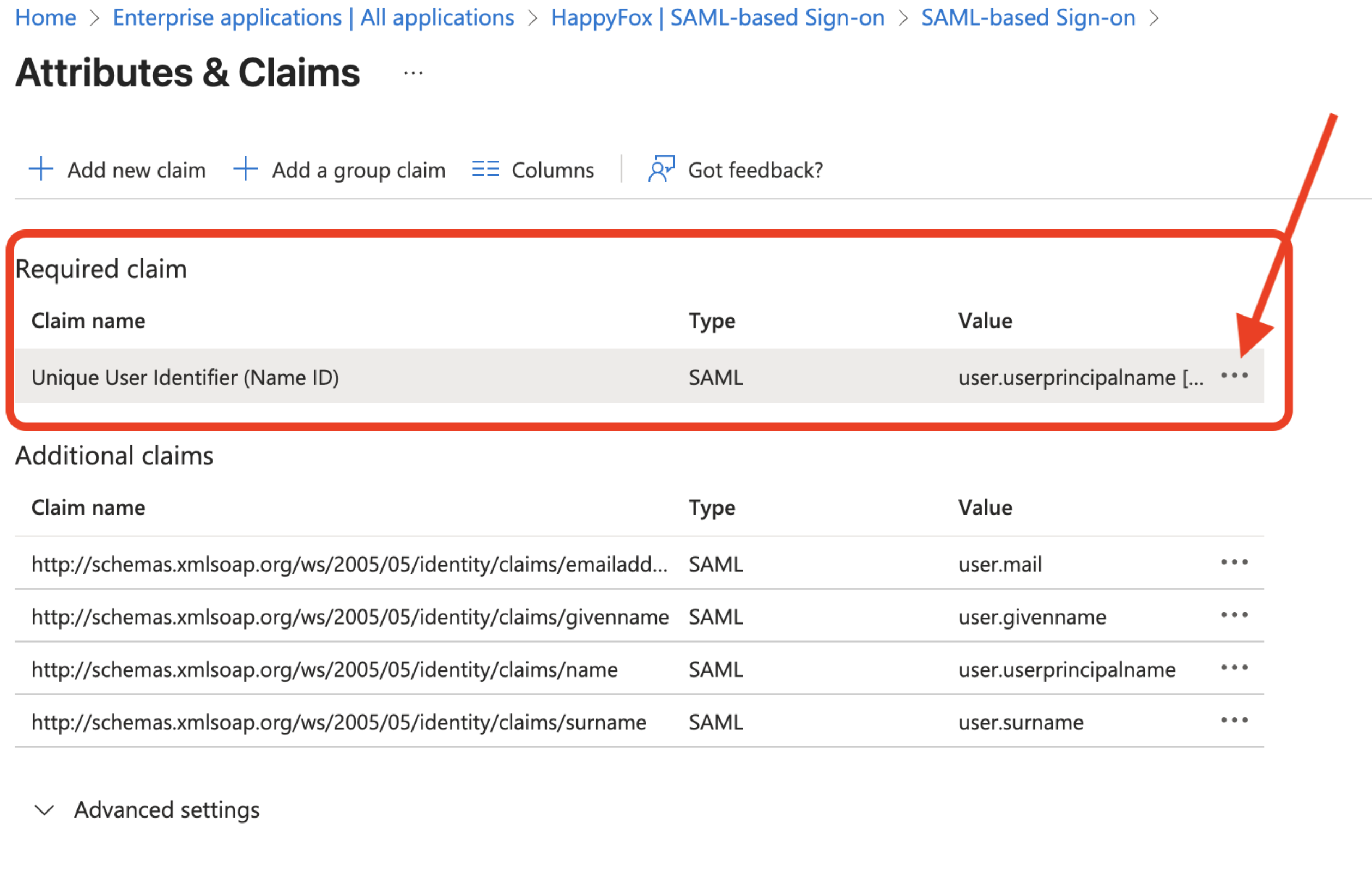 3. Click the three dots button next to the Unique User Identifier (Name ID)