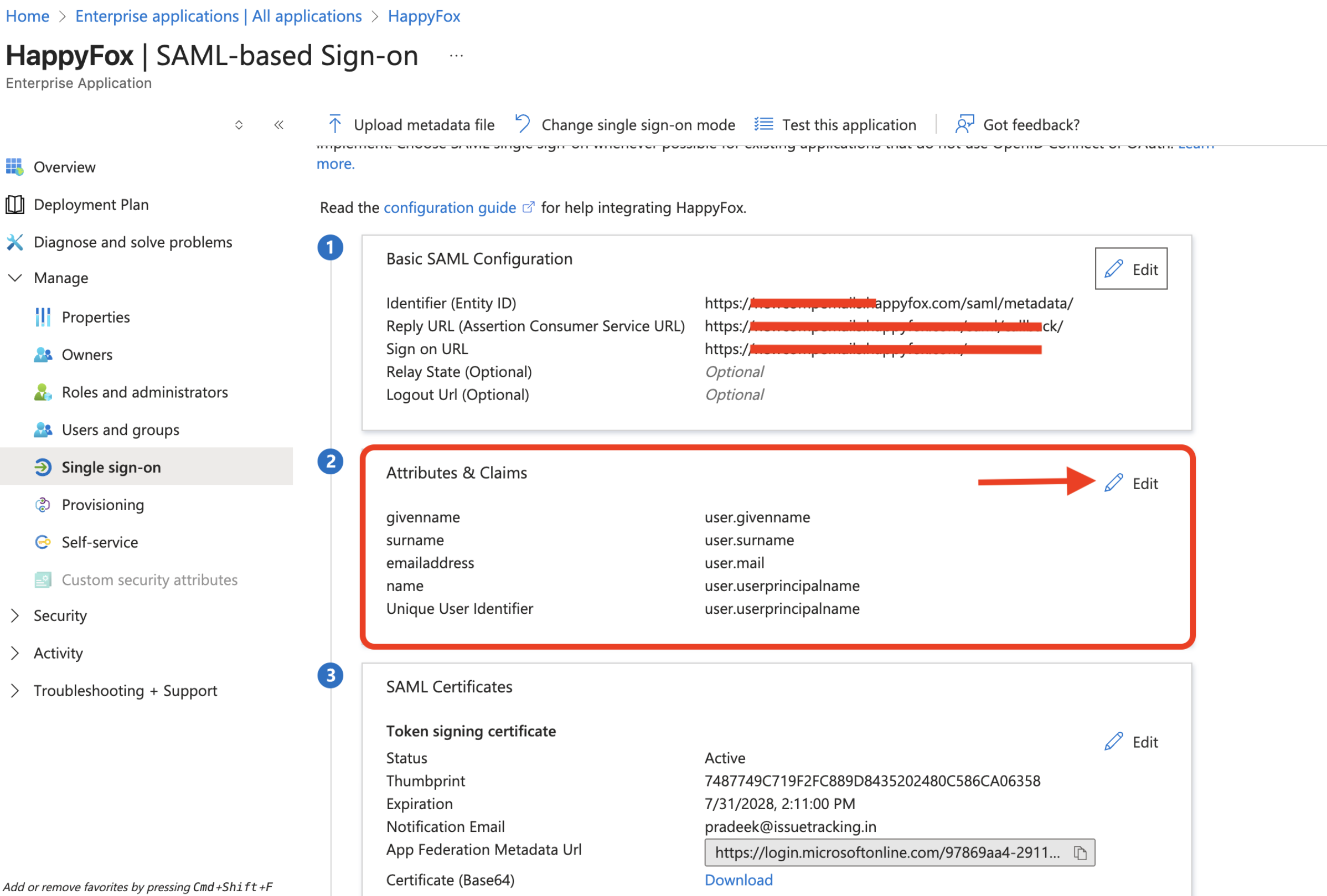 Note: If SSO is being setup using Custom SAML Method app from HappyFox app catalog, then use the below values in the Enterprise Application that configured in Azure/Entra ID