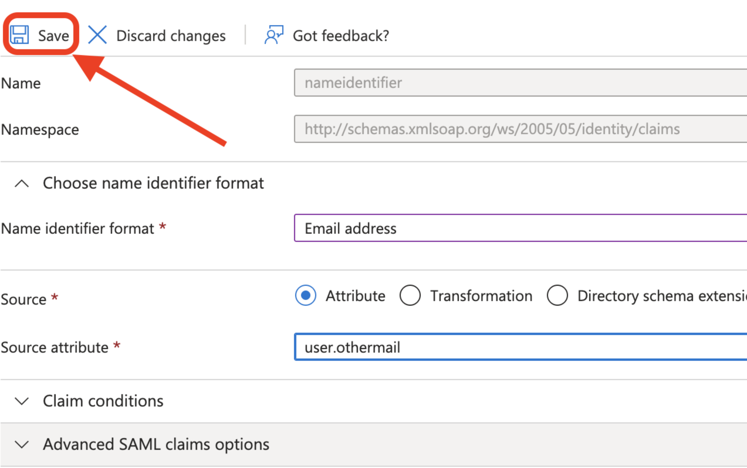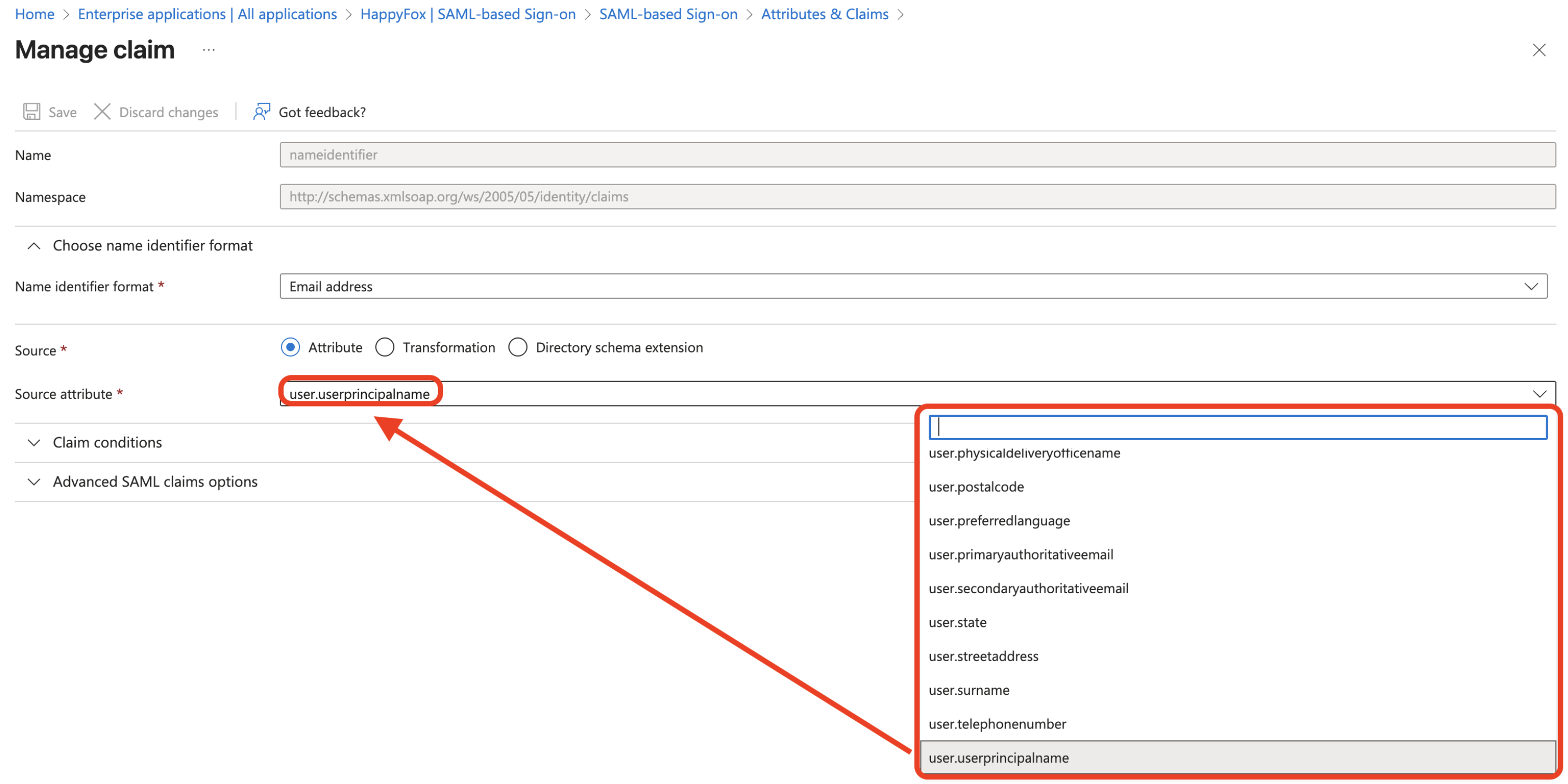 4. Update the Source attribute from user.userprincipalname to another field that carries the email address that is supposed to be sent to HappyFox
