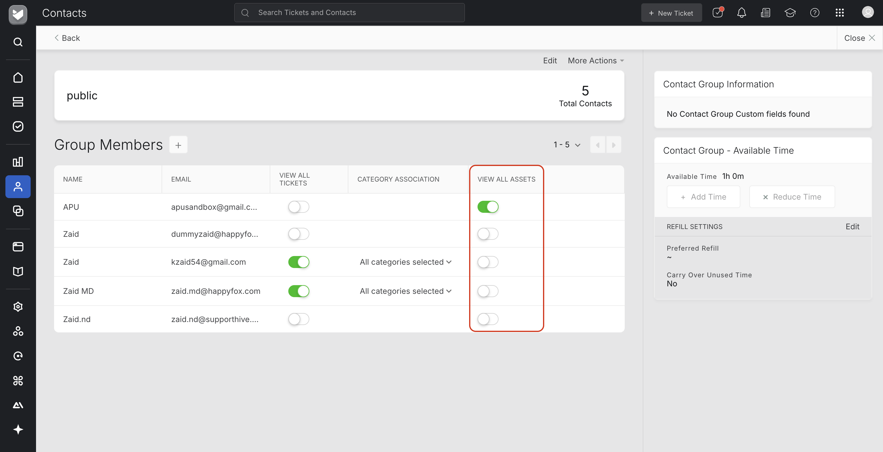 5.Contacts can be granted the View All Assets permission. When enabled, these contacts will be able to view and link all assets associated with their contact group. Contacts without this permission will only have visibility into the assets directly linked to them. Click Here to learn more on Linking Assets to Tickets.